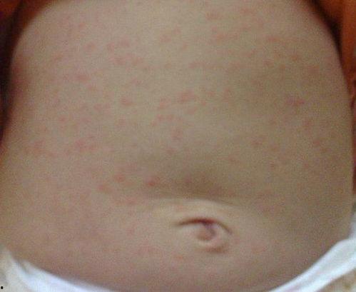 2. 皮疹:发热3-5天后,宝宝身上会出现红色的小丘疹,主要集中在颈部、躯干和四肢,皮疹不痒,一般持续1-2天。